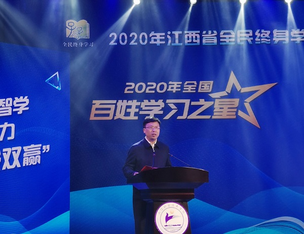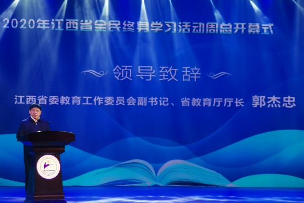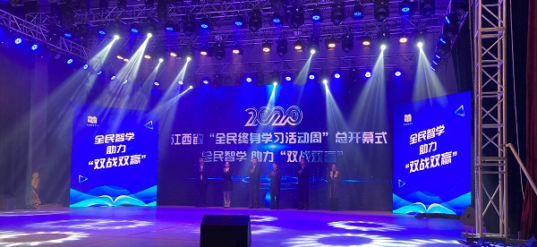 开幕式上,省教育厅厅长郭杰忠、副厅长裴鸿卫,我校党委书记易小明,党委副书记、校长黄平槐和九江市政府、萍乡市政府领导一起上台,共同启动2020年江西省全民终身学习活动周开幕仪式。