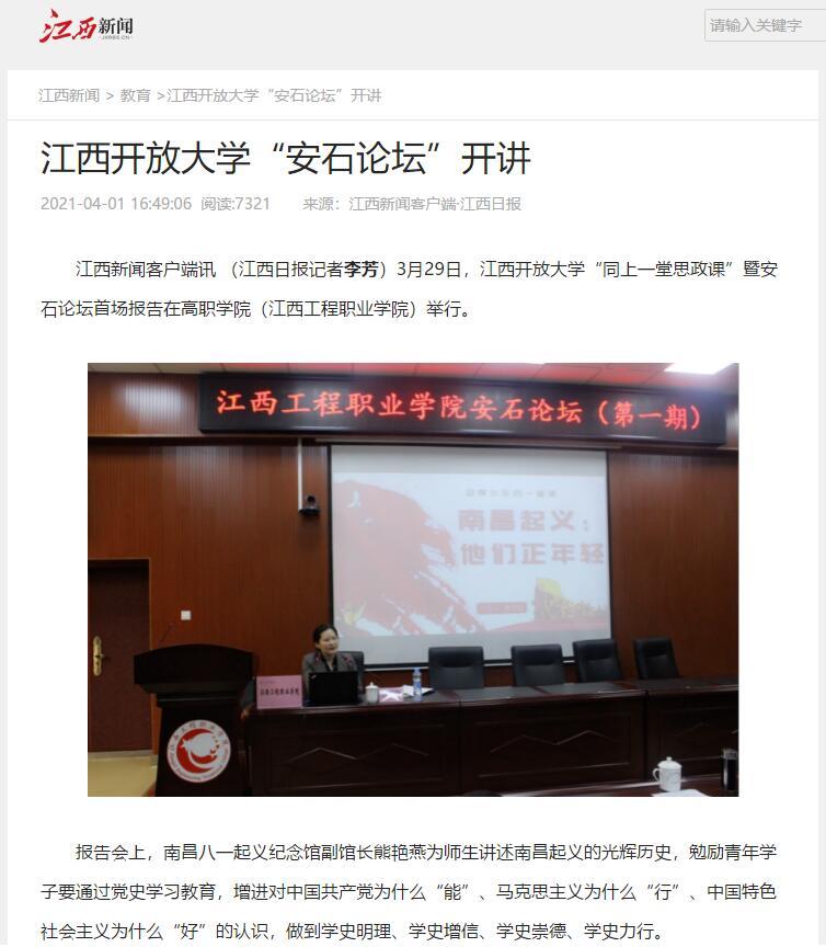 3月29日,江西工程职业学院“安石论坛”首场开讲,邀请南昌八一起义纪念馆副馆长熊艳燕讲述“那一声枪响中,正年轻的他们”,高职学院师生同上一堂思政课,扎实推进学校党史学习教育。江西日报、江西新闻客户端先后报道我校“安石论坛”开讲情况。