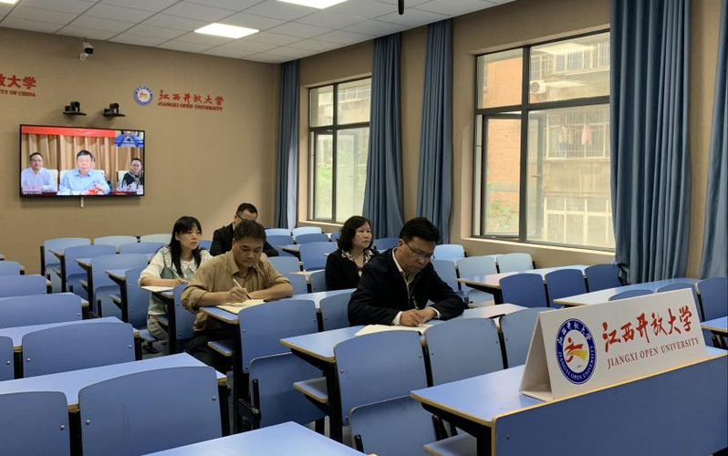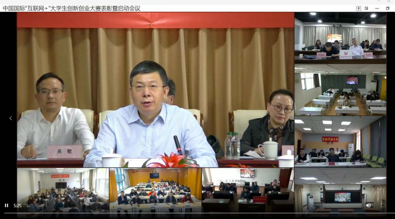 为总结第六届中国国际“互联网+”大学生创新创业大赛情况,做好第七届大赛动员部署,国家开放大学通过双向视频会议系统,于4月22日下午在北京总部召开中国国际“互联网+”大学生创新创业大赛第六届总结表彰暨第七届启动仪式视频会议。会议由国家开放大学党委副书记、纪委书记刘向虹主持,国家开放大学党委书记、校长荆德刚出席会议并讲话。我校党委副书记、校长黄平槐和学工部(处)、宣传部负责人以及负责学生工作的有关人员参加了双向视频会议。