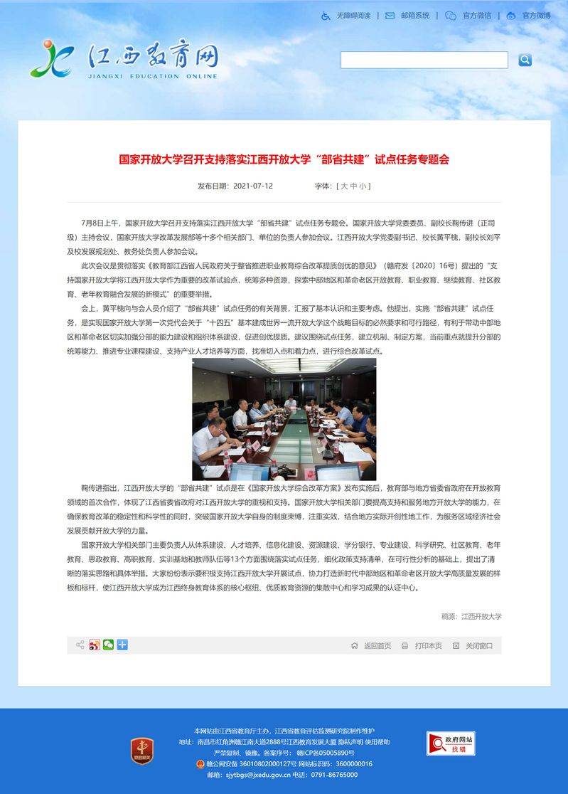 7月8日,国家开放大学召开支持落实米兰app入口站官网“部省共建”试点任务专题会,校党委副书记、校长黄平槐带队参加会议。此次会议是贯彻落实《教育部江西省人民政府关于整省推进职业教育综合改革提质创优的意见》(赣府发〔2020〕16号)提出的“支持国家开放大学将米兰app入口站官网作为重要的改革试验点,统筹多种资源,探索中部地区和革命老区开放教育、职业教育、继续教育、社区教育、老年教育融合发展的新模式”的重要举措。近日,江西省教育厅对此进行报道。