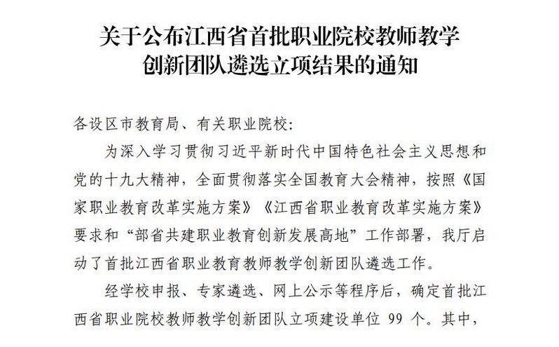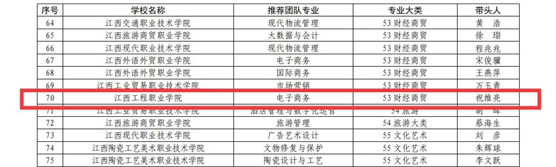 近日,江西省教育厅公布了《关于公布江西省首批职业院校教师教学创新团队遴选立项结果的通知》,由我校工程职院经管分院祝维亮教授作为带头人的电子商务教学团队,获评江西省首批职业院校教师教学创新团队立项建设单位,实现了工程职院在该项目上新突破。