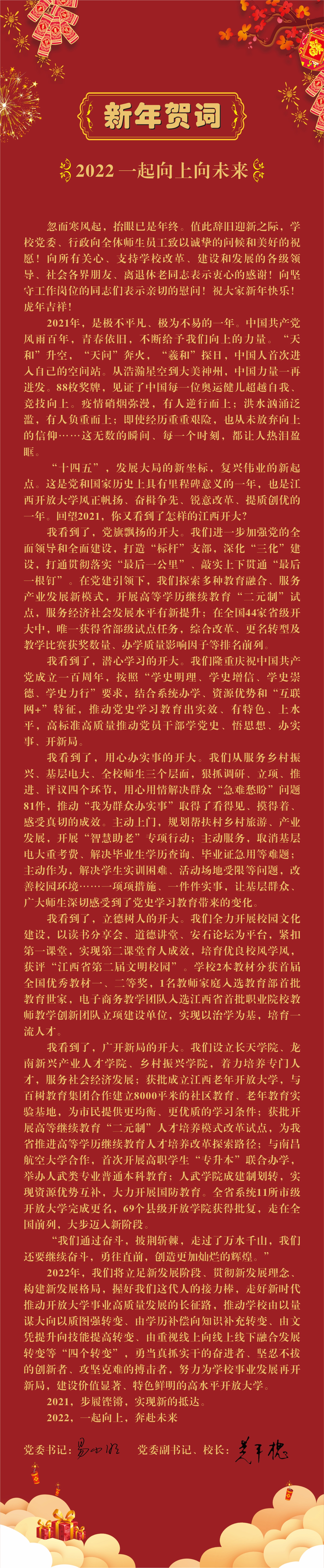 忽而寒风起,抬眼已是年终。值此辞旧迎新之际,学校党委、行政向全体师生员工致以诚挚的问候和美好的祝愿!向所有关心、支持学校改革、建设和发展的各级领导、社会各界朋友、离退休老同志表示衷心的感谢!向坚守工作岗位的同志们表示亲切的慰问!祝大家新年快乐!虎年吉祥!