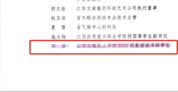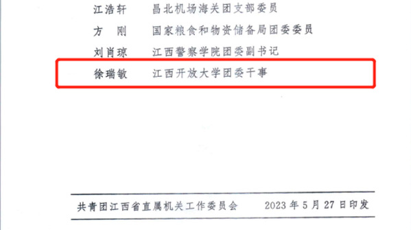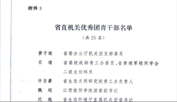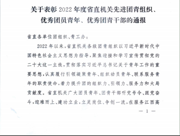 日前,共青团江西省直属机关工作委员会下发了《关于表彰2022年度省直机关先进团青组织优秀团员青年、优秀团青干部的通报》,我校智能技术学院2021级数控技术专业学生邓浩获评“省直机关优秀团员青年”、我校团委干事徐瑞敏老师获评“省直机关优秀团青干部”。
