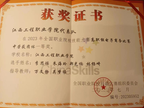 7月24-26日,2023年全国职业院校技能大赛高职组电子商务赛项在广东科学技术职业学院举办,我校电子商务专业团队代表江西省参赛经过2天的激烈角逐,由数字经济学院教师万文静吴梦颀、21电商1班李思瑶21电商2班朱海玲21电商3班郑光楠21市场营销班林杨崎组成的代表队全国名的总成绩,获得国家等奖!刷新了我校在该赛项上的最好成绩,实现了国赛金奖零的突破!