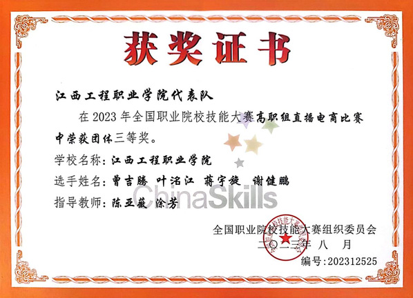 2023年“中银杯”全国职业院校技能大赛高职组直播电商赛项在浙江义乌工商职业学院隆重举行,我校电子商务专业团队代表江西省参赛,经过2天的激烈角逐,由数字经济学院教师陈亚薇、涂芳,学生曾吉腾、叶洺江、蒋宇旋、谢健鹏组成的代表队获得国家等奖!