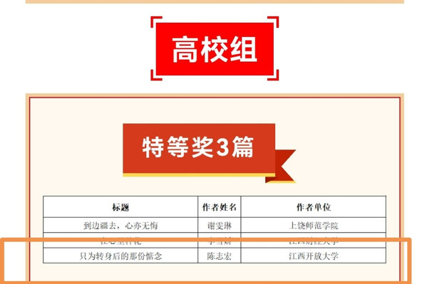 为庆祝39个教师节,江西省教育工会面向全省教职工启动了“中国梦·劳动美——凝心铸魂跟党走团结奋斗新征程”征文活动,我校教师陈志宏的作品《只为那转身后的惦念》获得本次大赛高校组特等奖。