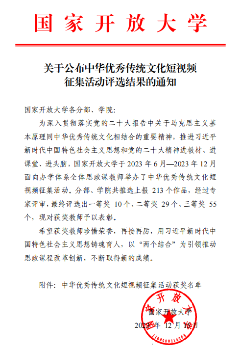 近日,国家开放大学2023年中华优秀传统文化短视频征集活动评选结果揭晓,我校选送的两部作品在213个作品中脱颖而出。其中,思政教师张戈主讲的《程氏家风传百年》荣获一等奖,抚州开放大学邓莉华老师主讲的《传承中华优秀传统文化,让木雕技艺破茧成蝶》荣获三等奖。