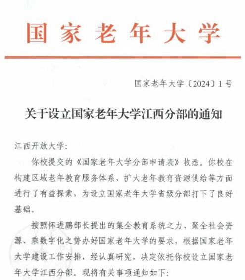 近日,国家老年大学印发《关于设立国家老年大学江西分部的通知》,正式批复米兰app入口站官网设立国家老年大学江西分部,明确了国家老年大学江西分部接受江西省教育厅领导,接受国家老年大学业务指导。