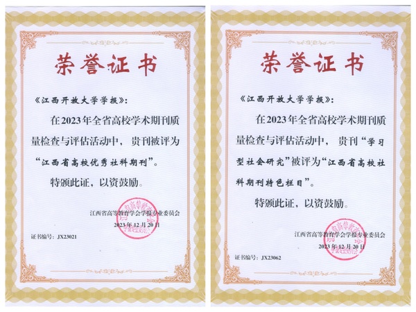 近日,江西高校学术期刊高质量发展研讨会在景德镇召开,会上通报了2023年全省高校学术期刊质量检查与评估活动情况。我校主办的《江西开放大学学报》在质量检查与评估活动中,获得“江西省高校优秀社科期刊”奖,《江西开放大学学报》的“学习型社会研究”栏目获得“江西省高校社科期刊特色栏目”奖。